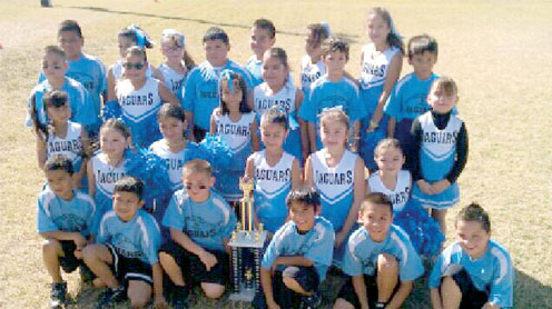 The Boys & Girls Club of San Benito 7A Division Flag Football Champions were crowned recently, and they are the Judge Oscar De La Fuente Elementary Jaguars. The team went 12-0 on the season, 10-0 in the regular season and 2-0 in the championship playoffs. Coaching the team were Richard Montalvo and Alex Garcia. The players pictured are Jaydyn Montalvo, Alex “Hondo” Garcia, Antonio Torres, Manuel Rodriguez, Rene Muñoz, Nathan Zepeda, Cody Martinez, Damon Barnes, Joaquin Mendoza, Ramon Mata, Luis Salinas, and David Torres. The cheerleaders shown are Ofilia Muñoz, Erika De Los Santos, Raven Rios, Sahaira Bedolla, Citlalith Mata, Camila Mata, Leylah Montalvo, Dinora Vela, Thalia Torres, Naria Garcia, Mandy Villarreal, Nadia Robles, Audrey Hernandez, and Janine Sierra. (Courtesy photo)