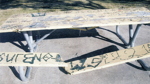 The park bench pictured was damaged by vandals who also destroyed flood lights at the W.H. Heavin Amphitheater in San Benito. The lights were part of the city's Christmas decorations. (City of San Benito photo)