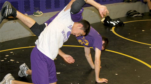 San Benito Greyhound varsity wrestler Allen Ray Pope is shown being taken down to the mat by another fellow grappler during a practice on Thursday. (Staff photo by Francisco E. Jimenez)