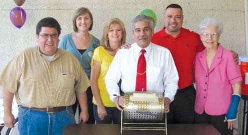 The San Benito Friends of the Library is raising funds to complete the newly constructed outdoor patio canopy with lighting and ceiling fans by selling raffle tickets for a variety of prizes. Shown drawing the winning ticket is San Benito Police Chief George Gomez. Also shown are San Benito Public Library Director Jerry Salazar, Friends Secretary Valerie Hopperstad, Friends Treasurer Terry Cortez, Friends President Ernest Quintanilla, and Friends Member Wanda Kellogg. (Courtesy photo)