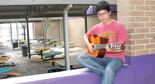 San Benito High School senior Diego Huerta, 17, is shown on campus playing his guitar. Huerta is a member of the Mariachi Del Sol band and the recipient of the 2011 San Benito News Scholarship. (Staff photos by Francisco E. Jimenez)