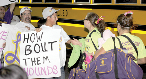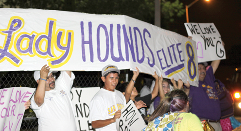 Celebratory photos are seen when the San Benito Lady Greyhounds returned home to applause Saturday evening after defeating San Antonio Southwest Saturday in Corpus Christi. (Photos by Vince Galvan)