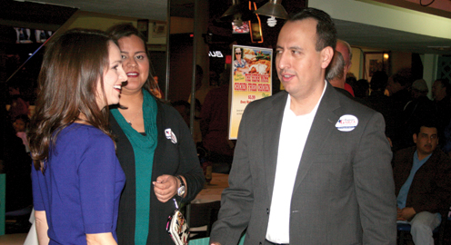 Congressional candidate Ramiro Garza (right) is shown shaking hands with supporters at a recent function.(Staff photo by Ray Quiroga)