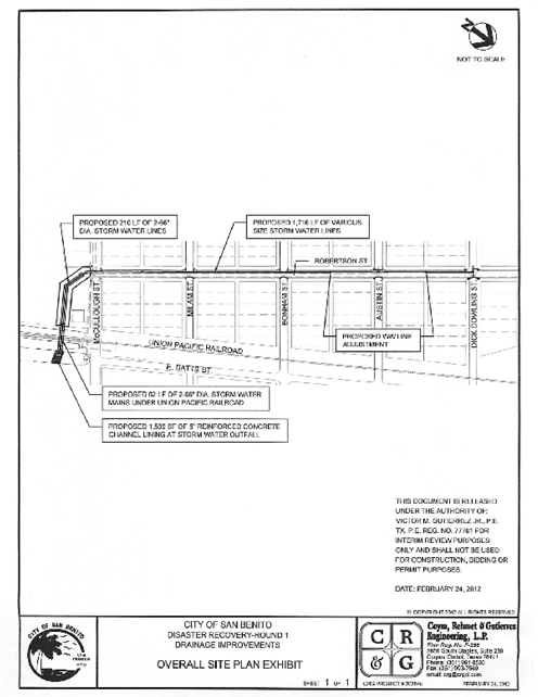 The improvements will continue across property owned by the San Benito Housing Authority and termi-nate at a drainage channel located adjacent and parallel to the Union Pacific Railroad. Two 66-inch diameter storm sewers will be installed under the railroad tracks to serve as the outfall for other storm sewer im-provements. These proposed improvements lay the groundwork for future phases and well.
