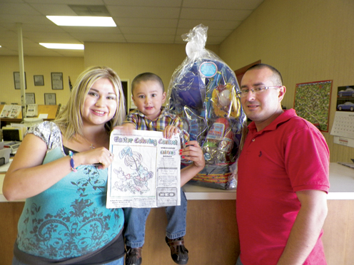 San Benito’s own Isaiah Anthony Franco, 7, is pictured with his parents, Roberto Franco and Victoria Rendon, after winning the San Benito News Easter Coloring Contest in the 5-7 age division. Isaiah is shown with his winning drawing and Easter basket. (Staff photo by Michael Rodriguez)
