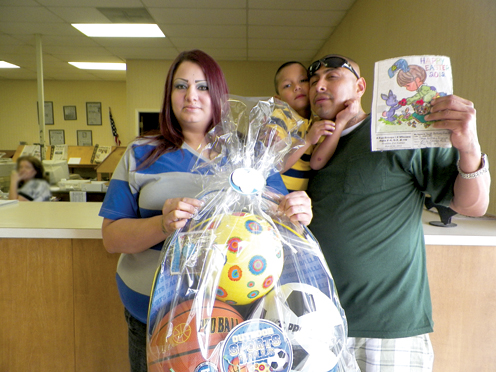 Two-year-old Derek Izaguirre of San Benito is shown with his parents, Joseph Izaguirre and Yvette Zuniga, after winning the San Benito News Easter Coloring Contest in the 2-4 age division. Derek is pictured with his winning drawing and Easter basket. (Staff photo by Michael Rodriguez)