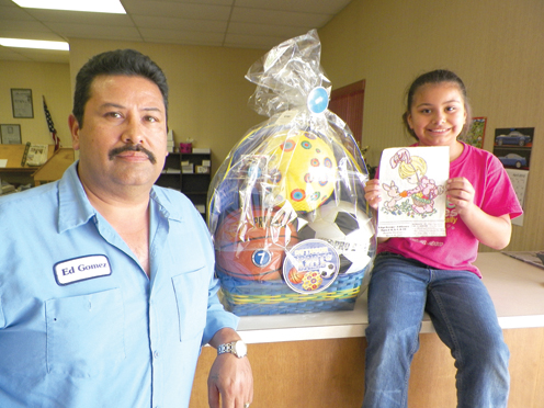 Shelby Gomez, 8, of San Benito is seen here with her father, Eddie Gomez, after winning the San Benito News Easter Coloring Contest in the 8-10 age division. She’s pictured with her winning drawing and Easter basket. (Staff photo by Michael Rodriguez)