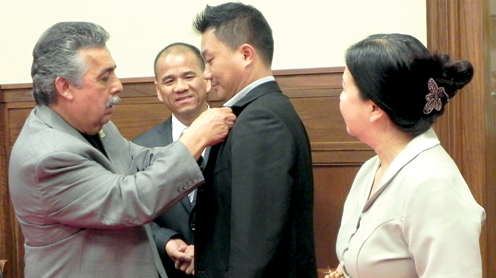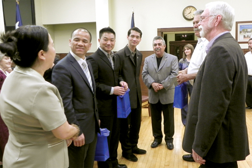 City of San Benito, state and county officials are shown with Chinese businessmen who visited the area recently. The Chinese businessmen and area dignitaries are pictured gathering inside the San Benito Municipal Building. (City of San Benito photos)