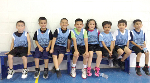 The 5-6 year old Jaguars basketball team went undefeated this season; players shown (from l-r) are Mark K. Ybarra, Noe Zavala, Jr., Devin Silva, Trey Rodriguez, Meagan Delgado, Erik Maya, Mariano Garcia, and Jeremiah Gonzales. (Courtesy photo)
