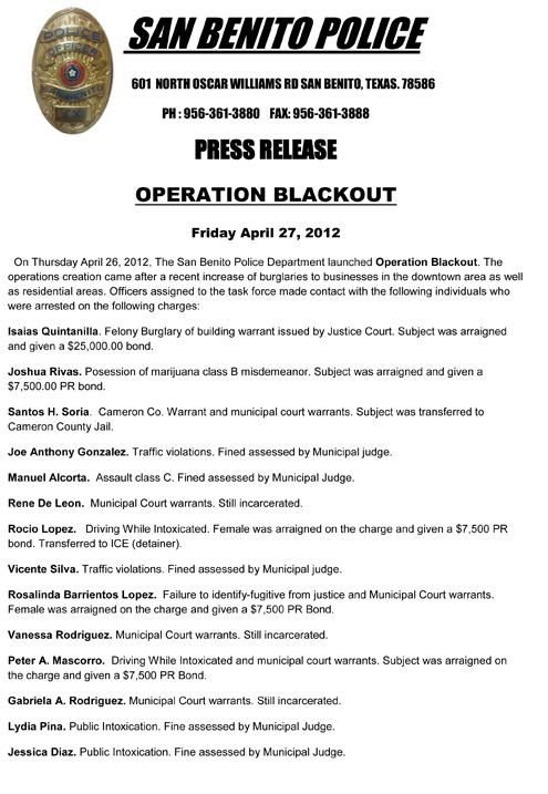 According to Operations Chief Martin Morales, Jr. of the San Benito Police Department (SBPD), an initiative termed “Operation Blackout” has been implemented by authorities as a result of what the chief termed “a pattern of burglaries” that has only escalated in recent weeks.