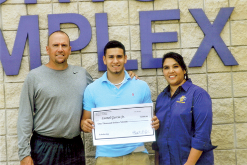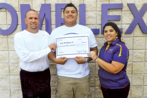 Leonel “LJ” Garcia, Jr. of the San Benito Greyhound varsity football team is shown accepting a $1,000 scholarship from the San Benito Quarterback Club. Presenting the check was QB Club President Rosa “Rosie” G. Leal and Athletic Director and Head Football Coach Spencer Gantt. LJ is one of nine scholarship recipients. (Courtesy photo)