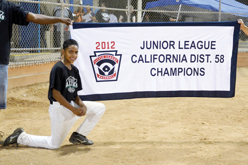 Twelve-year-old Steven Sanchez, son of Erasmo and Guadalupe Sanchez of San Benito, was instrumental in helping the 29 Palms Junior Boys All-Stars make history by bringing the city of 29 Palms, Ca its first Boys Junior League California District 58 championship in the 13-14 year-old age division. Sanchez, known for his defensive skills, also lit up opposing pitchers by averaging .550 over 10 postseason games. He has also helped guide the 29 Palms Major Boys All-Stars to their first-ever Boys Major League District 58 championship game last year. (Courtesy photos)