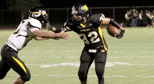 Rio Hondo Bobcat running back Rolando Vega is shown using a stiff arm to evade defenders during Friday night action at home against Santa Rosa. Also seen here is QB Juan Puga. (Photos by T.J. Tijerina)
