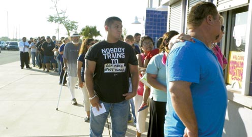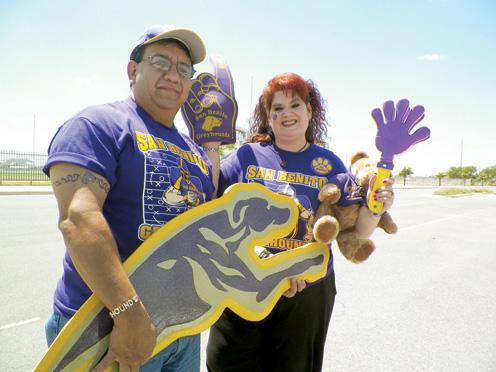 Avid San Benito Greyhound fans Hector and Betsy Avila are shown outside Bobby Morrow Stadium on Tuesday. Also pictured is the line at the stadium on the same day for tickets to this Friday’s Battle of the Arroyo. (Staff photos by Michael Rodriguez)