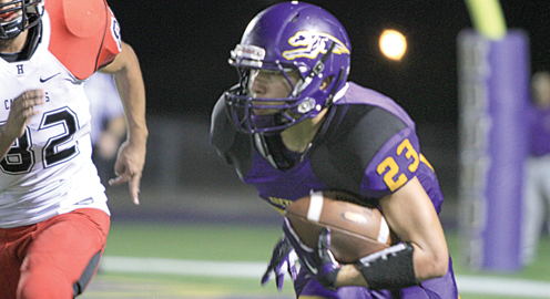 San Benito Greyhound running back Arturo Coronado is pictured running the ball against the Harlingen Cardinals Friday in the Battle of the Arroyo. (Photo by Vince Galvan)