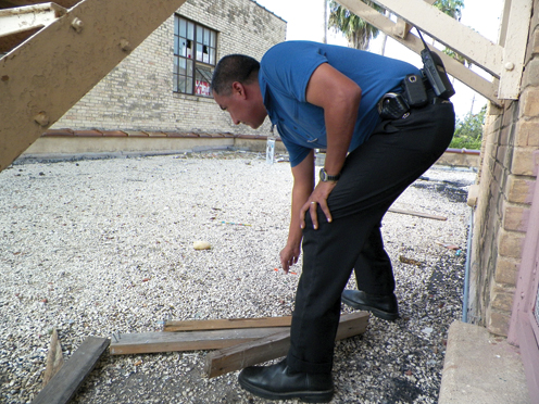 Assistant Operations Chief Michael Galvan of the San Benito Police Department is pictured collecting a hypodermic needle from the third floor roof of the Stonewall Jackson Hotel on Friday. A gap large enough to see inside an apartment at the hotel and open windows leading to a fire escape are also shown. (Staff photos by Heather C. Cox)