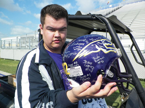 Avid San Benito Greyhound fan Marcus Lowery was surprised Tuesday when the team honored him at Bobby Morrow Stadium with an autographed helmet and a Dallas Cowboys towel signed by Dez Bryant. (Staff photos by Michael Rodriguez)
