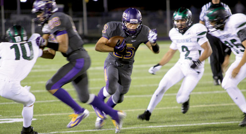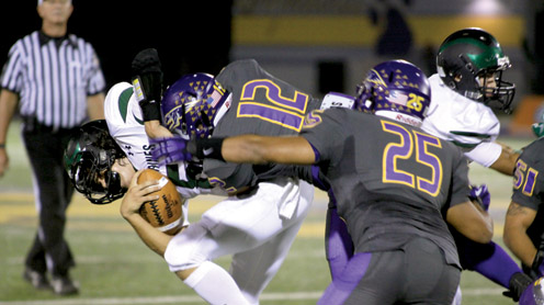 San Benito Greyhound linebacker Alan Bejaran is pictured (above) tackling a PSJA Memorial back Friday night. Also seen is running back Arturo Coronado cutting through the Wolverine defense. (Photos by Vince Galvan)