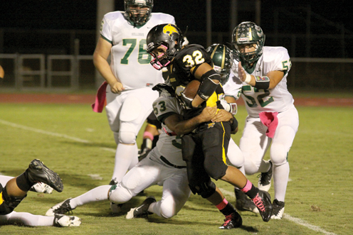 Rolando Vega, running back for the Rio Hondo Bobcats, is seen carrying three Lyford Bulldogs on his way toward positive yardage Friday at Bobcat Stadium. (Photo by T.J. Tijerina)