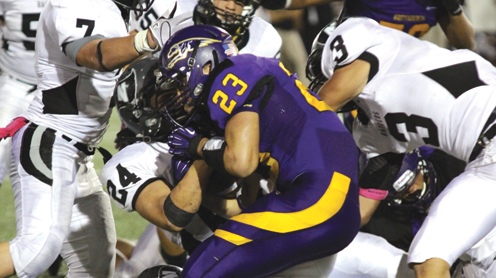 San Benito Greyhound running back Arturo Coronado is pictured being tackled by three PSJA North Raiders in Friday’s game at Bobby Morrow Stadium. (Photo by T.J. Tijerina)