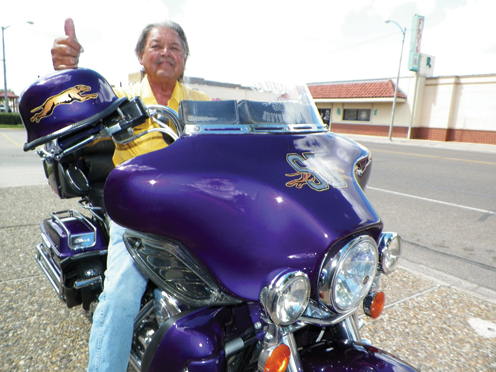 But Peter also has the luxury of being in possession of all three of these don’t-mess-with items. As a San Benito native, he’s a proud Texan, he’s the even prouder owner of a 2003 Harley Davidson Full Dresser and – perhaps most importantly – he’s an avid fan of the San Benito Greyhounds.