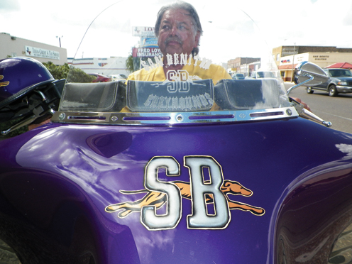 “I went to a Harley Davidson store, and my wife knows that’s my favorite color,” Peter said of the purple Harley that would eventually become his. “I knew we were going to buy it. Then I got the windshield engraved, saying ‘San Benito Greyhounds’ with the running Greyhound logo.”