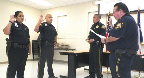 Larry Michael Medina and Elizabeth Cantu were sworn in Thursday as the San Benito Police Department’s newest entry level police officers. Also seen are SBPD Operations Chief Martin Morales and Assistant Operations Chief Michael Galvan. (Staff photos by Heather Cathleen Cox)