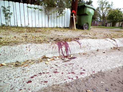 Blood stains the ground near Winchell St., where Angel Perez of San Benito was suspected to have been stabbed to death on Monday. (Staff photo by Michael Rodriguez)