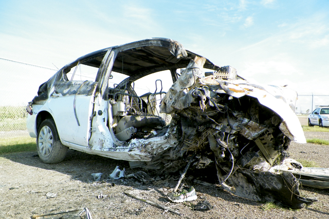 Charred remains are all that’s left of a vehicle that was driven by a Harlingen woman killed in an accident that occurred in San Benito on Saturday. The car is seen Monday at the San Benito Police Department. (Staff photo by Heather Cathleen Cox)
