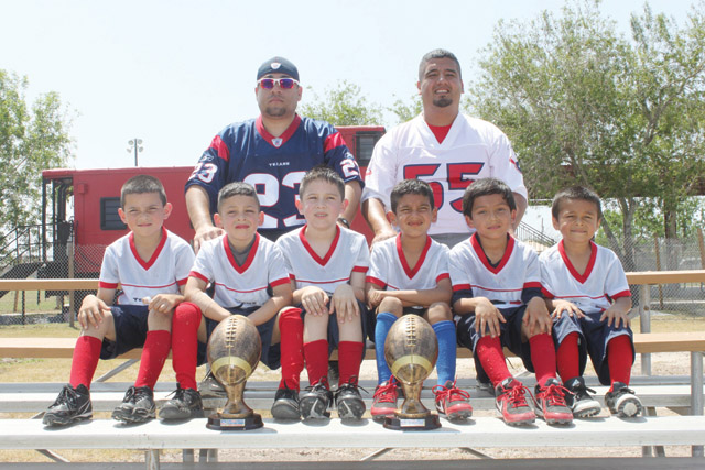 The 5-6 year-old San Benito Texans are the local NFL Flag Football League end-of-season tournament champions. Texans pictured (from l-r) are Ricky Olivares, Jason Rodriguez, Adam Cortez, Tommy Ramirez, Robby Leal and Ethan Gomez. Coaches shown (from l-r) are Lionel Cortez and Tommy Ramirez. (Courtesy photo)