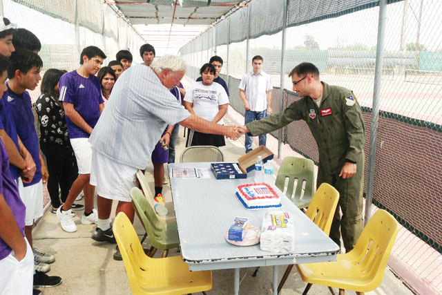 Matthew Sanchez pic2-5-26-13Upon arriving home, U.S. soldiers tend to have family and friends to look forward to, but Air Force Senior Airman Matthew Sanchez was sure to make visiting the San Benito High School Tennis team a priority on Thursday.
