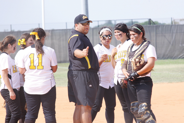 Rio Hondo Lady Bobcats softball coach Brett Esparza is seen giving instructions to his team. Coach Esparza along with Athletic Director Rocky James recently expressed their support of the San Benito Lady Greyhounds in their bid for a state championship this weekend. (Photo by T.J. Tijerina)