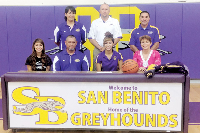 Seen with San Benito High School faculty and coaches is 2013 graduate Cejay Banuelos (sitting, center). Banuelos, joined by her parents and sister, is shown Thursday signing a letter of intent to attend the Bacone College in Muskogee, Oklahoma, where she plans on playing basketball, inside the SBHS varsity gym.