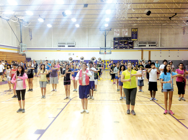 Members of the San Benito High School Mighty Greyhound Marching Band are seen practicing inside the SBHS gym on Friday as part of a band summit, which lasts Thursday, August 1 to Saturday, August 3.