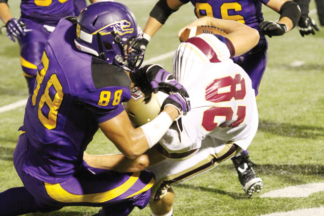 Manuel Sanchez of San Benito is shown at Bobby Morrow Stadium making a tackle Friday night against the Los Fresnos Falcons.