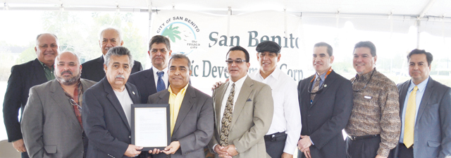 San Benito News photo by Francisco E. Jimenez Congressman Filemon Vela is seen with members of the San Benito City Commission and San Benito Economic Development Corporation Board of Directors, including Mayor Joe H. Hernandez and Board Chair Pete Claudio.