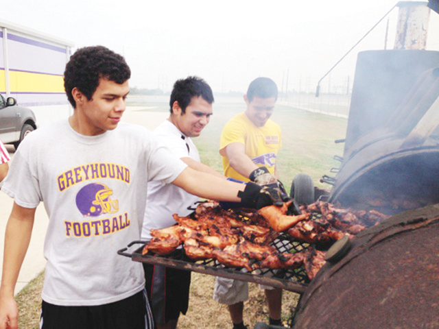 Football players from the San Benito Greyhounds varsity squad were assisted by the San Benito Greyhounds Quarterback Club on Saturday in holding a barbeque fundraiser for a teammate and his family, who are struggling to make ends meet.