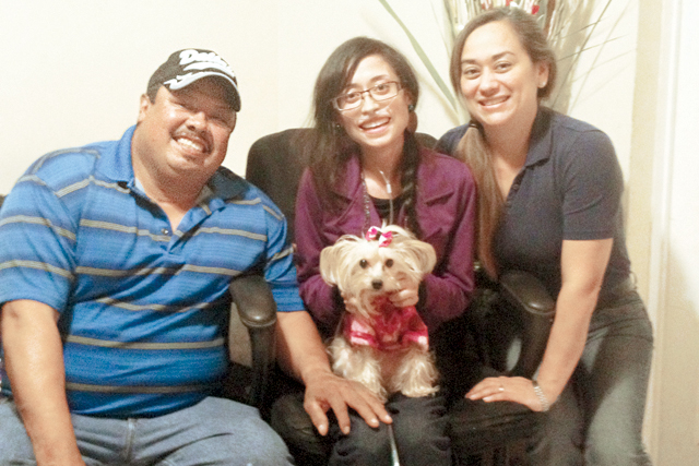 Janet Mata and her Yorkshire Terrier Mei-Ling are seen with Janet’s parents, Hortencia and Reynaldo Mata, inside their San Benito home on Thursday.