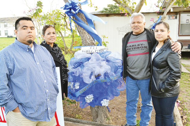 Mark Piñon, Leticia Piñon Pereira, Jose Manuel Piñon and Nancy Garcia are pictured outside the Commerce Street home of Ramon Piñon (also shown), who was murdered at the age of 84 in 2009.