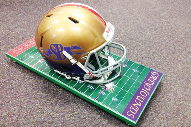 The San Benito Quarterback Club will hold a drawing for a beautiful football helmet emblazoned with the Greyhound logo on one side and the Cardinal logo on the other. The one-of-a-kind helmet will go to a lucky winner at next week’s game.