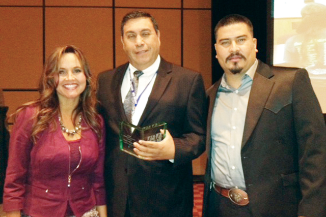 Rio Hondo Mayor Gustavo Olivares is seen (right) accepting recognition on behalf of the city at a conference in Plano, Texas on Friday.