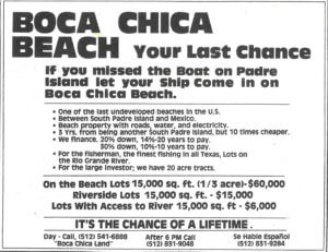 In those yonder years, Boca Chica Beach went unnoticed to the rest of the Valley—it was Brownsville’s beach—the people of Brownsville owned it. Today, piece by piece, we are losing our connection with na