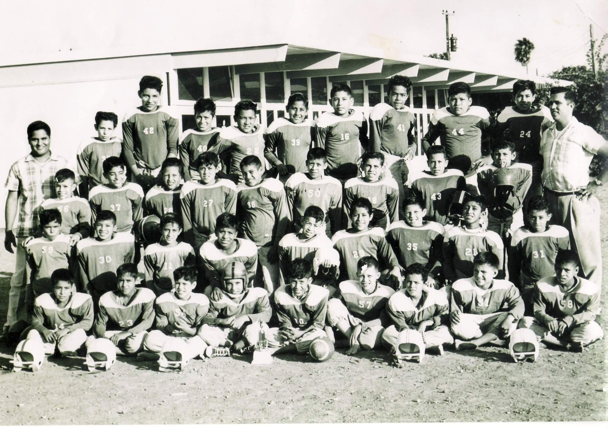 Motley crew — Seen is the 1960 Frank Roberts Hornets’ championship football team. Some players wore jeans because there were not enough uniforms to go around. Arturo Flores is seen third from the right in the front row. (Archival photo/Hector R. Barrera, Ph.D.)