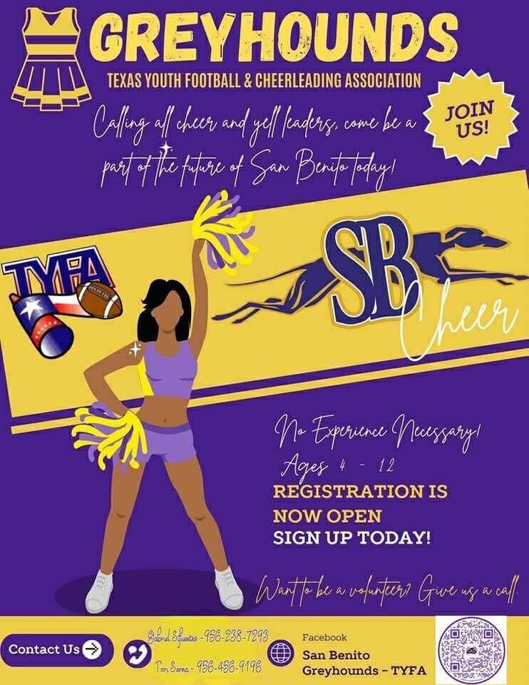 Registration is now open for the San Benito Greyhounds’ 2025 Texas Youth Football Association (TYFA) fall season. The program is entering its 13th year and is currently signing up players, cheerleaders, and volunteer coaches across multiple age groups.
